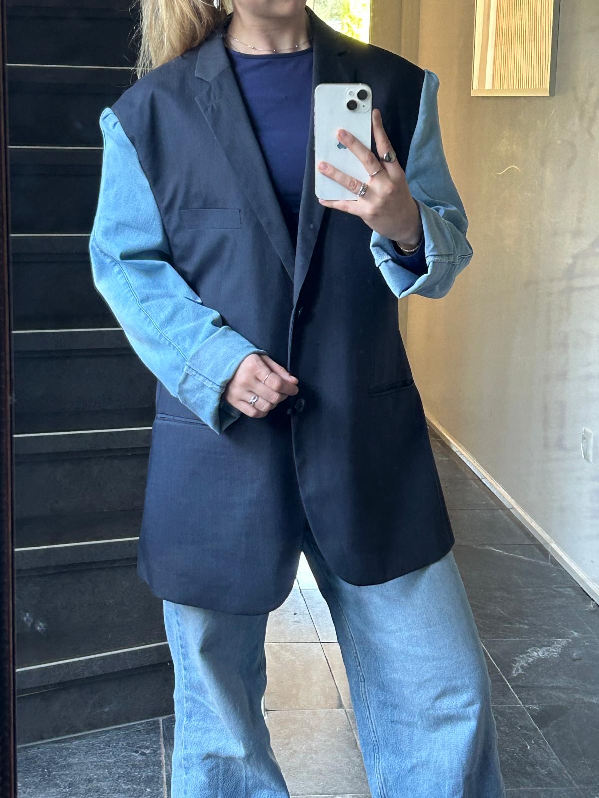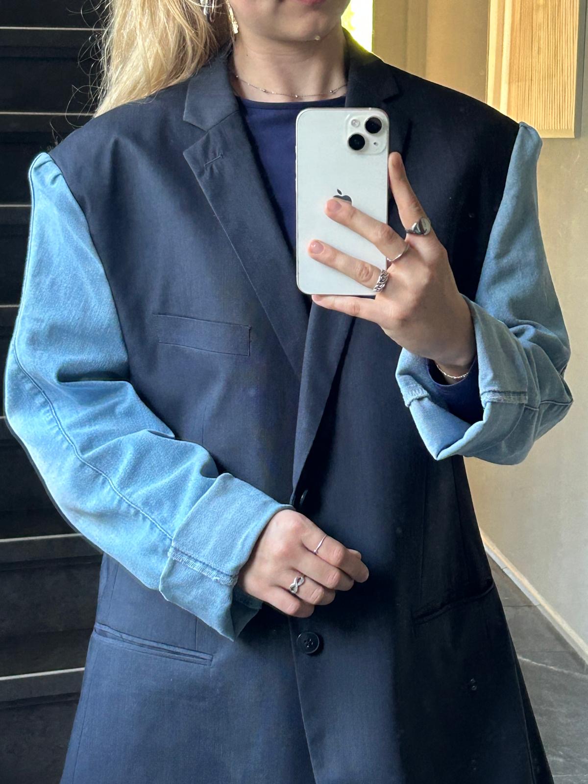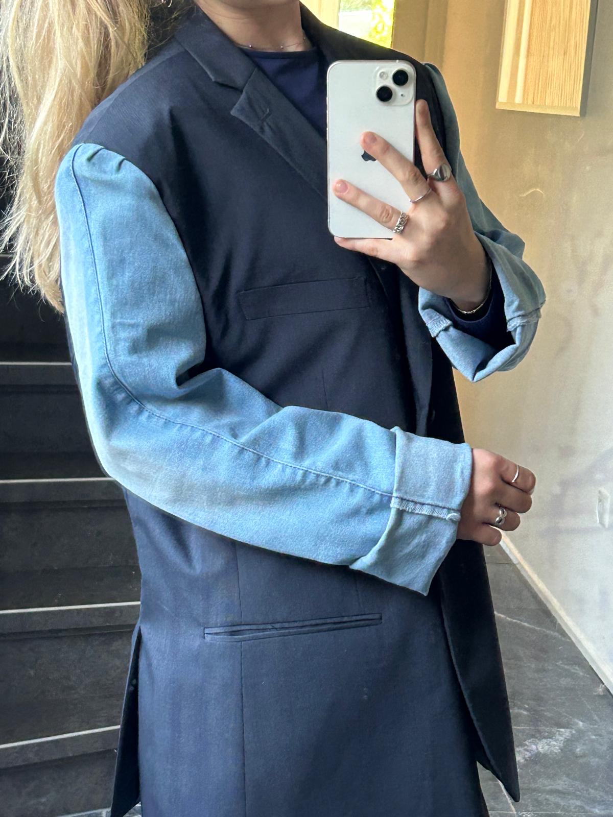 donkerblauw met een heel fijn streepje. Lichte spijkerbroek mouwen